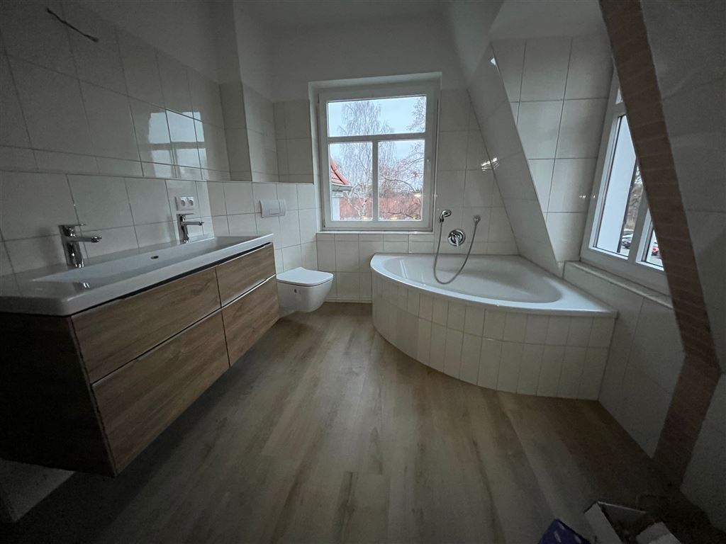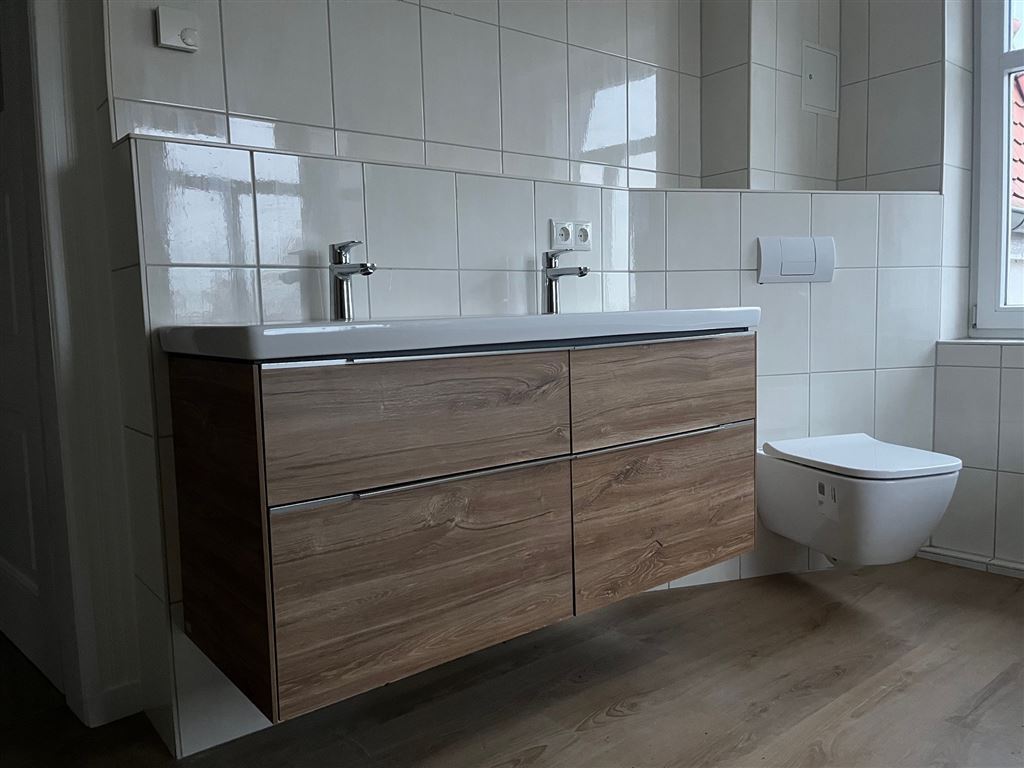 Das modern ausgestattete Badezimmer überzeugt mit zeitgemäßer Ausstattung.